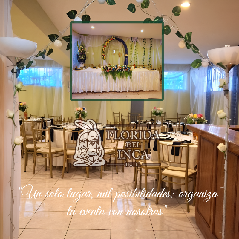 En el Hotel Florida del Inca, transformamos cada celebración en una experiencia inolvidable. Nuestro elegante salón de eventos se adapta a todo tipo de compromisos: bodas, aniversarios, reuniones familiares, eventos empresariales y más. Con una decoración versátil, atención personalizada y un ambiente acogedor, garantizamos que tu evento tenga el estilo y la calidez que merece. ¡Déjanos ser parte de tus mejores momentos!